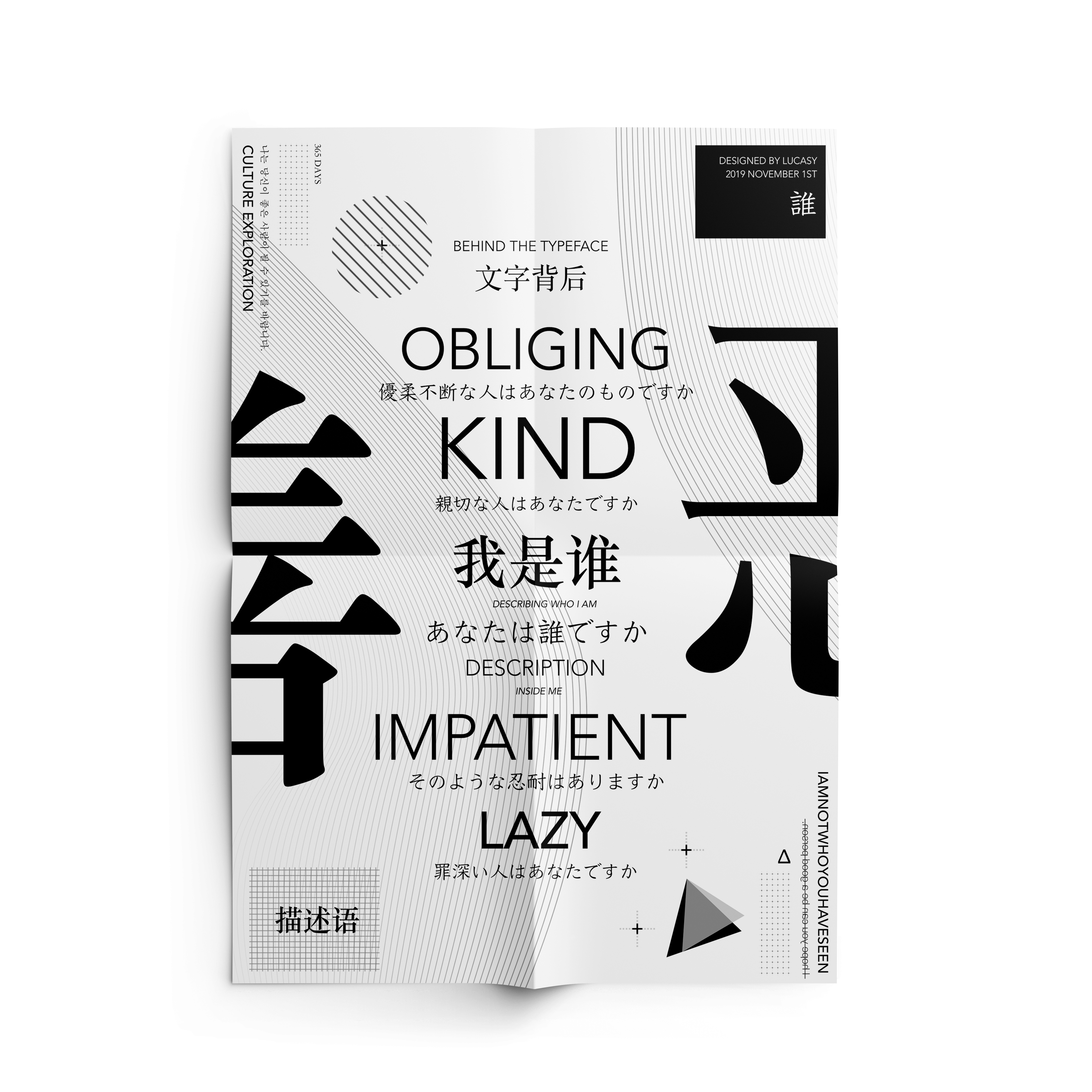 This project is aimed for expressing one’s identities by six different words. Each word has a chapter discription. The following line shows the time follow of one’s life experience. Also, the word on the front page combined different language which stands for his literature background and knowledge. Those geometric elements indicate his understanding of typography at that time. The Title of this booklet is “善恶“, which means kind or evil. The philosophy is “No one can be simply defined as good or bad”. It is always relative. And it changes over time and experience. Like ripples, small events can have a huge impact.