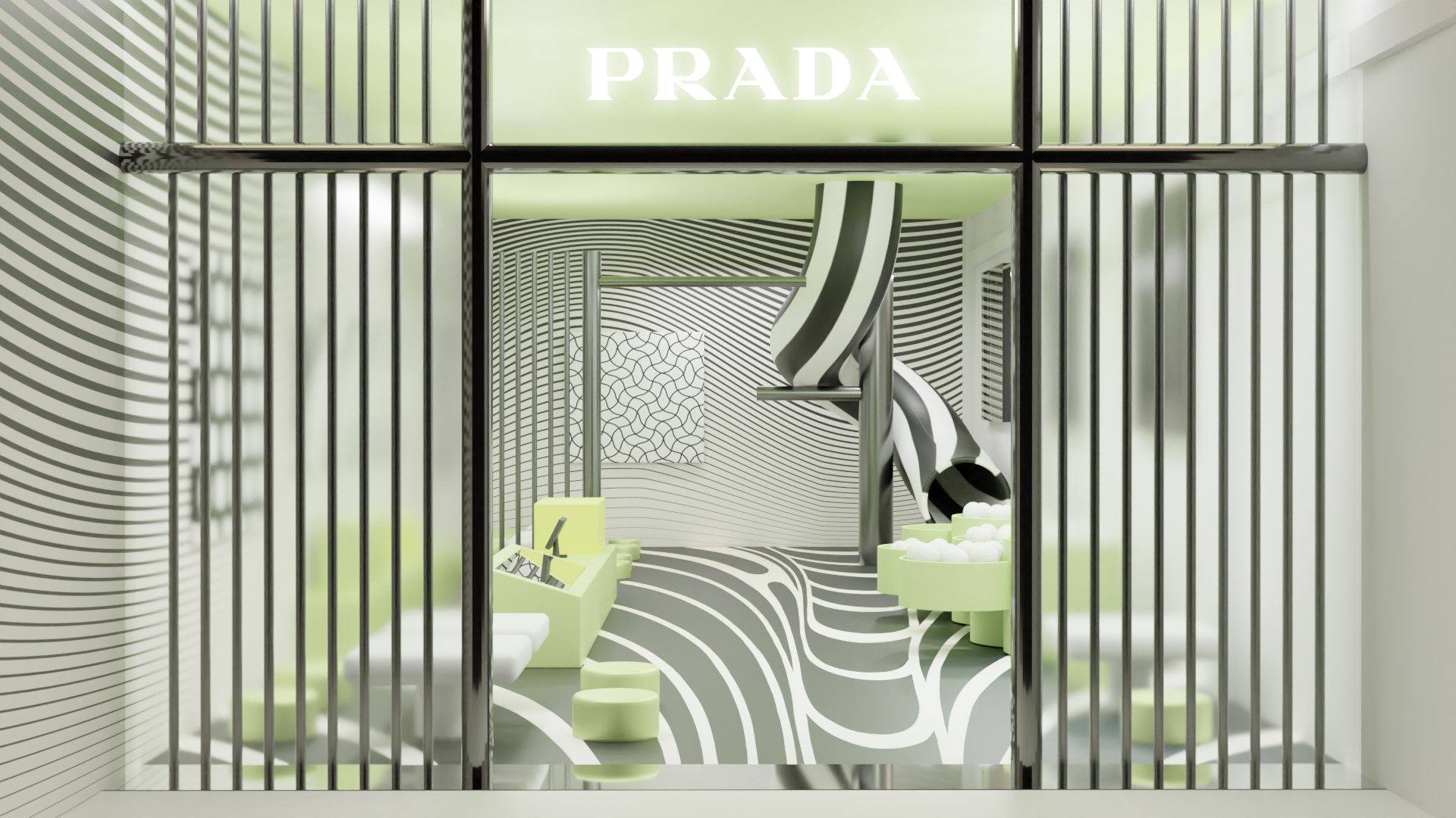 In the Showfields, there is a vertical shuttle experience of different spaces. After entering from the gate, visitors will first take the elevator to the top floor. Then go through the slide to the Feels Like Prada area.
